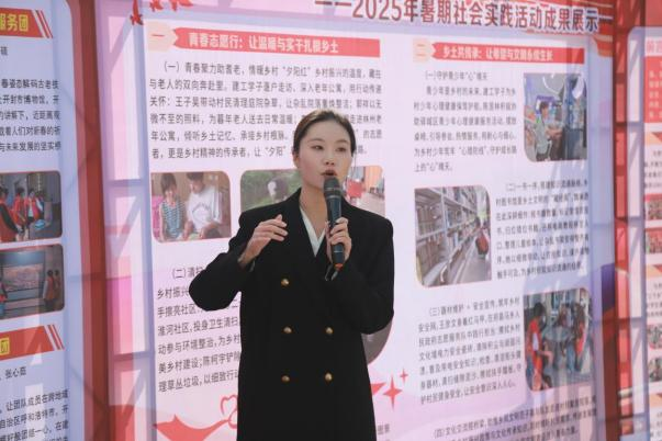 (文图/赵阳霄)为全面总结我校2025年暑期社会实践活动育人成效,10月21日,我校在双创园举行2025年暑期社会实践活动成果展。党委副书记、副校长王美英出席活动,学生工作部部长陈晴晴,相关单位负责人,各院(部)党委书记、团委书记及社会实践团队成员、学生代表参加。
