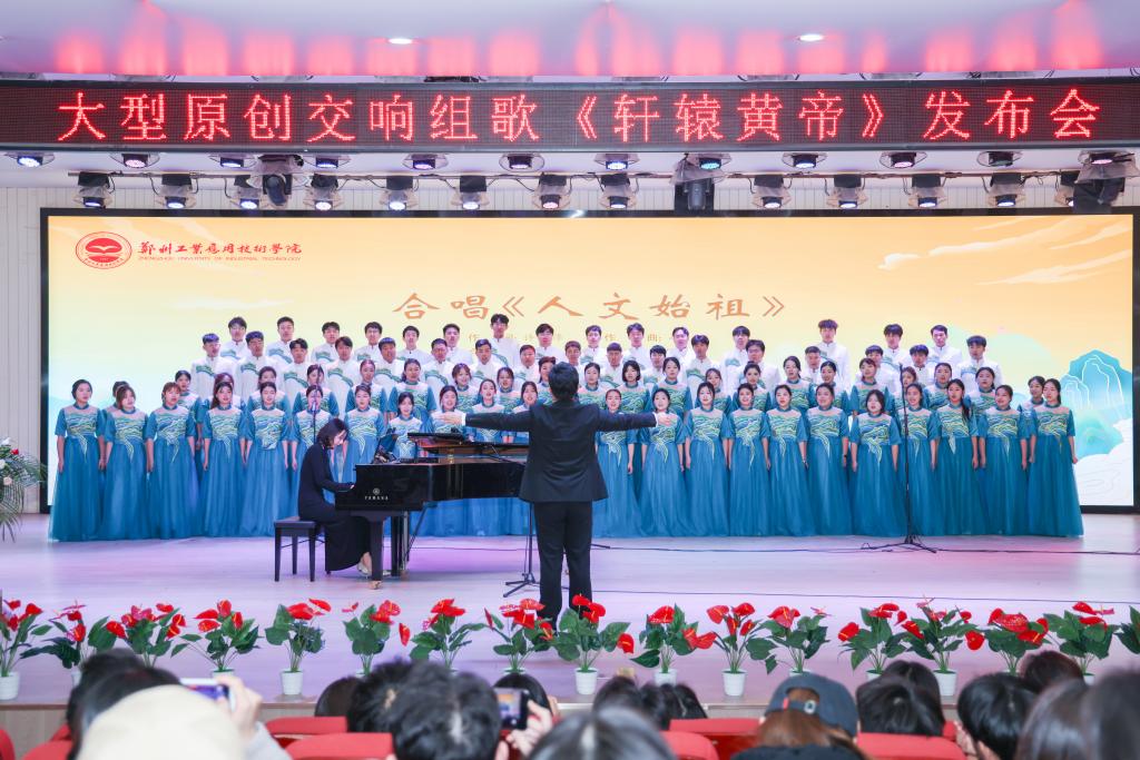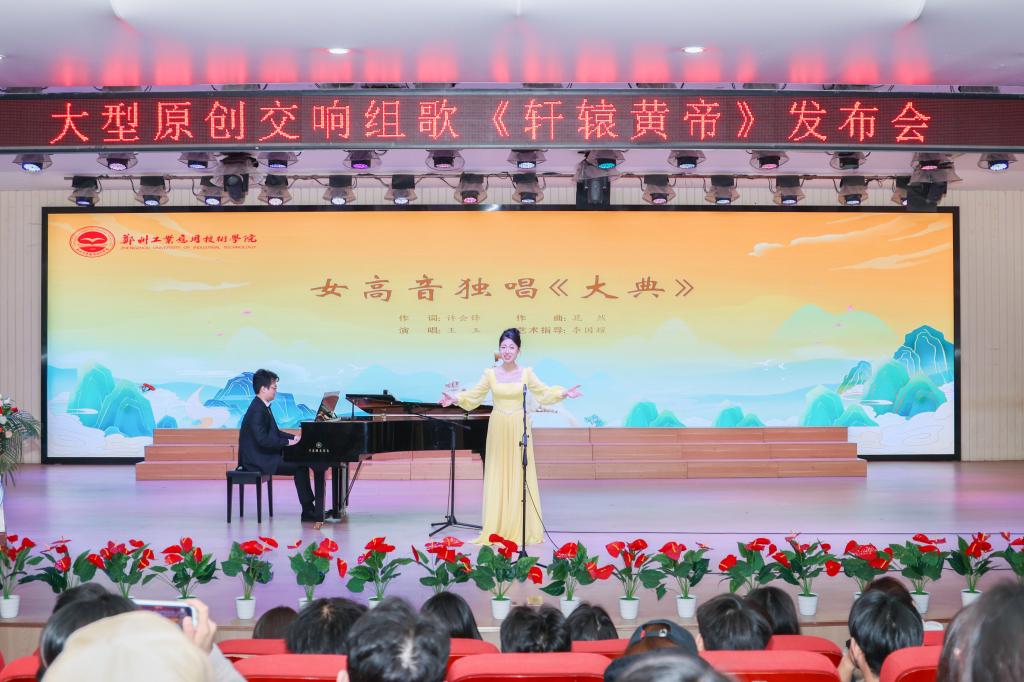 学校音乐与教育学院混声合唱团和表演团队现场演绎《轩辕黄帝》序曲合唱《人文始祖》、女高音独唱《大典》。
