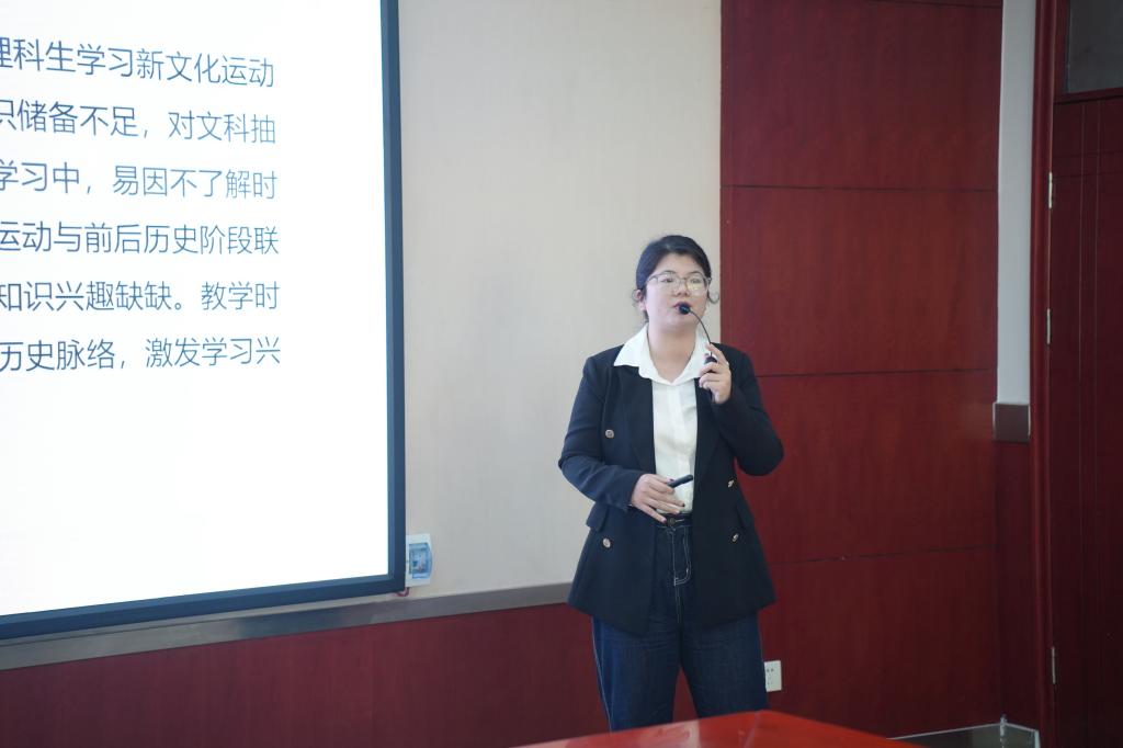 备课会以“说课展示+多维评议+协同诊断”的创新形式展开,现场气氛热烈,讨论深入。说课展示环节,马克思主义学院杨洁老师以《中国近现代史纲要》课程“专题五”为内容,进行了别开生面的教学展示,她将宏大叙事与时事热点紧密相连,既有理论深度,又有情感温度,引得在场教师频频点头。