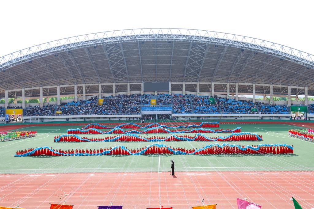 入场式结束后,现场举行庄严的升国旗仪式。全体师生肃立注目,高唱国歌,鲜艳的五星红旗在体育中心上空冉冉升起。
